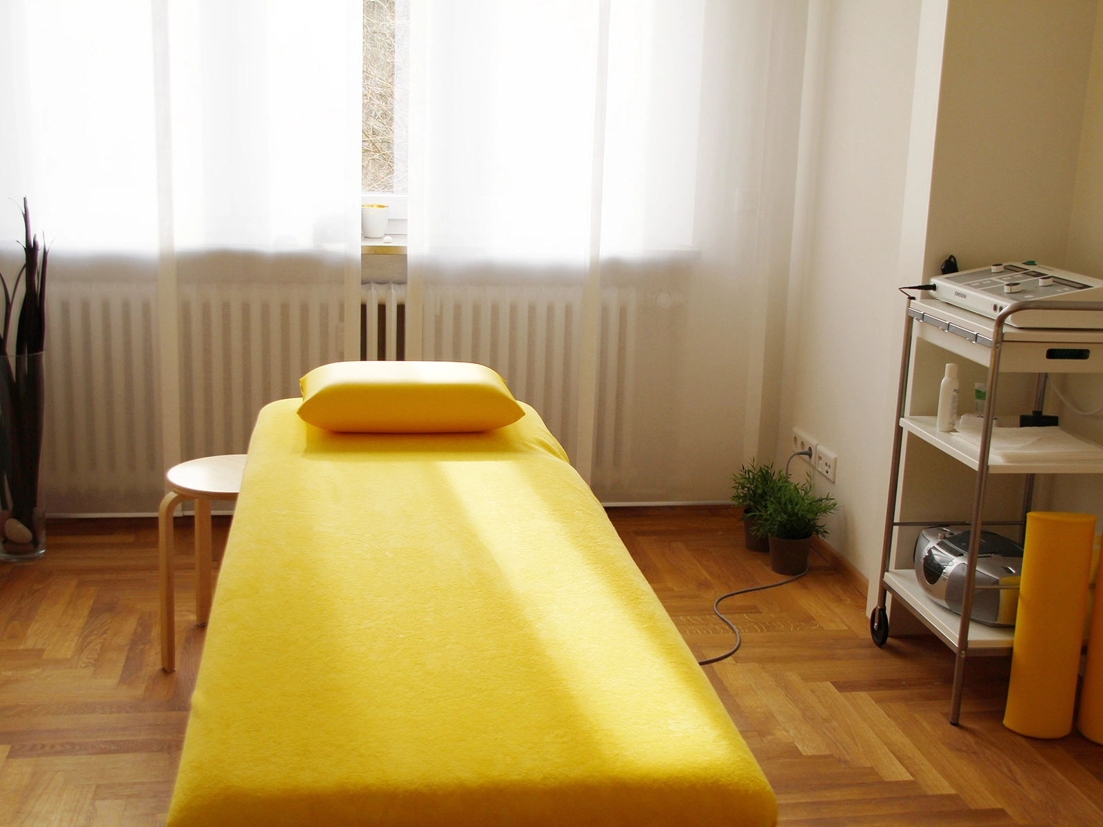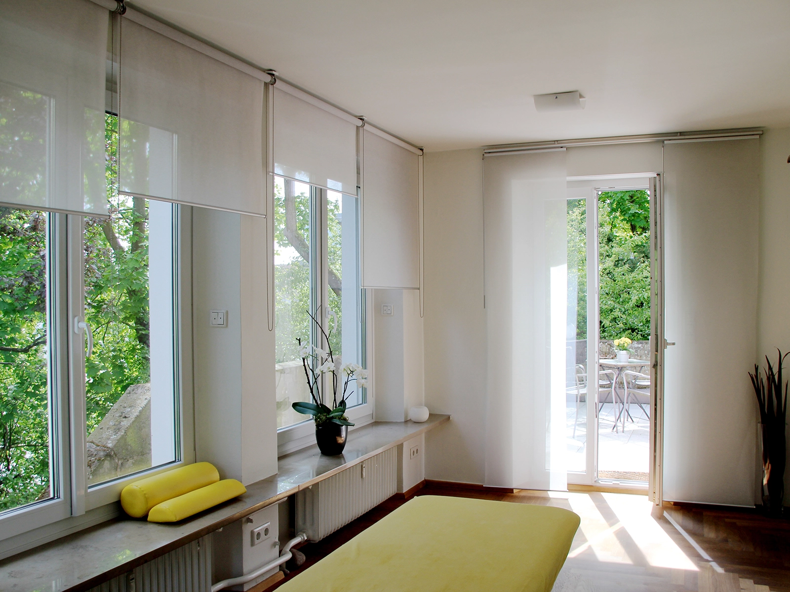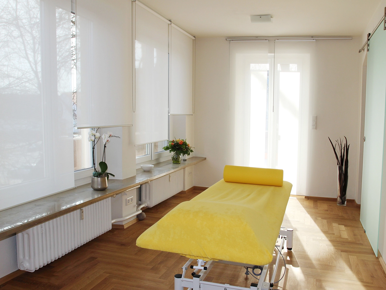Wir möchten, dass Sie sich bei uns wohlfühlen. Die großzügigen, lichtdurchfluteten Therapieräume haben eine angenehme, entspannende Atmosphäre. Eine große Terrasse ergänzt unsere Praxis im Grünen.